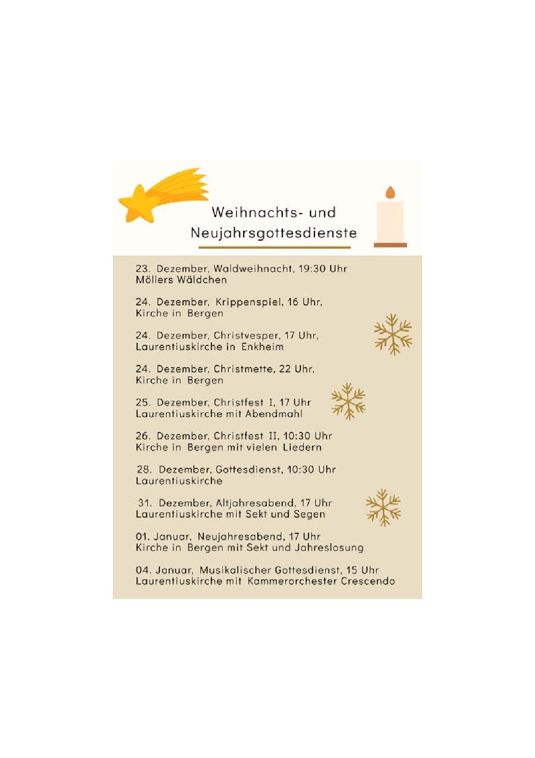 Herzliche Einladung zu allen Gottesdiensten. Wir wünschen Ihnen und Euch eine wunderlichte, sehnsuchtsglitzernde, frohmachende, geheimnisknisternde, freudeliebende, mußevolle,engelgleiche, segensleichte Weihnachtszeit und ein behütetes, neues, gutes Jahr 2026