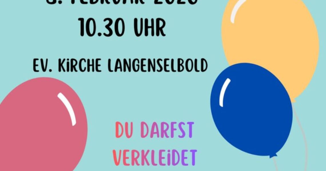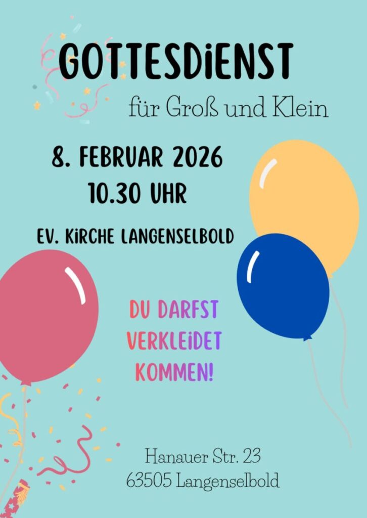 Herzliche Einladung zum Familiengottesdienst für Groß & Klein am 8. Februar um 10:30 Uhr in der Evangelischen Kirche Langenselbold mit Pfarrerin Lisa Henningsen! Wer mag, kommt zu diesem bunten Gottesdienst gerne in Verkleidung!