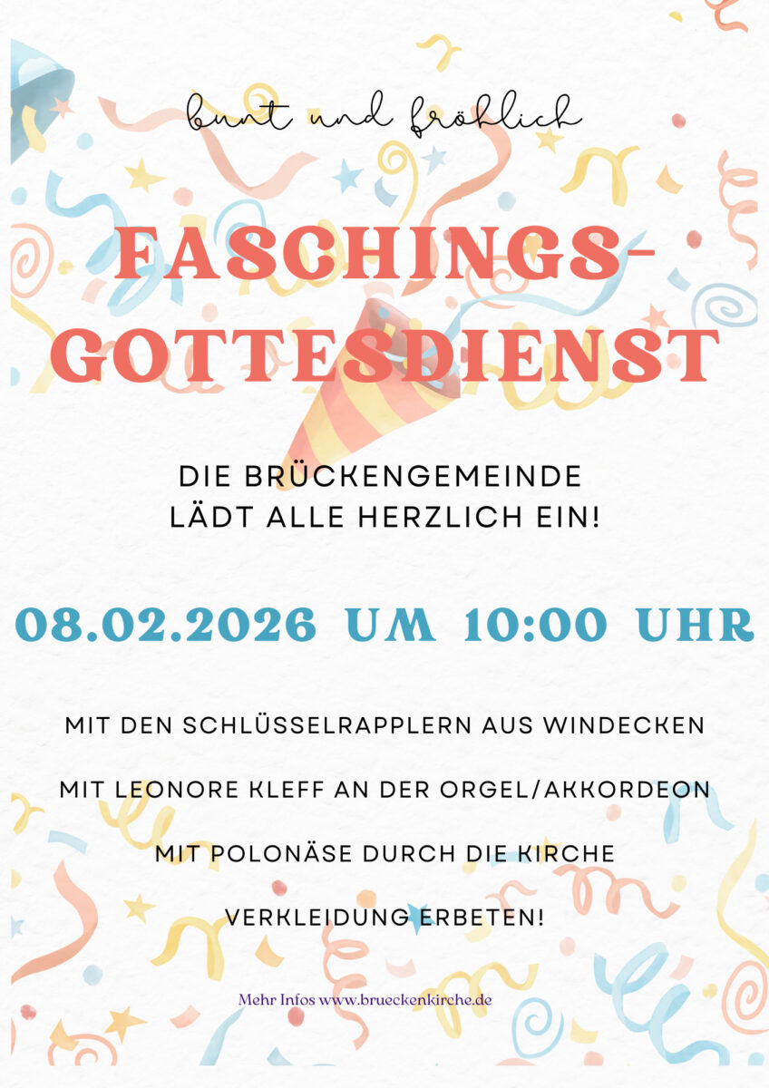 Zum Faschingsgottesdienst lädt die evangelische Brückengemeinde in Heldenbergen am Sonntag, 08.02.2026 in ihre Brückenkirche an der Bahnhofstraße ein.