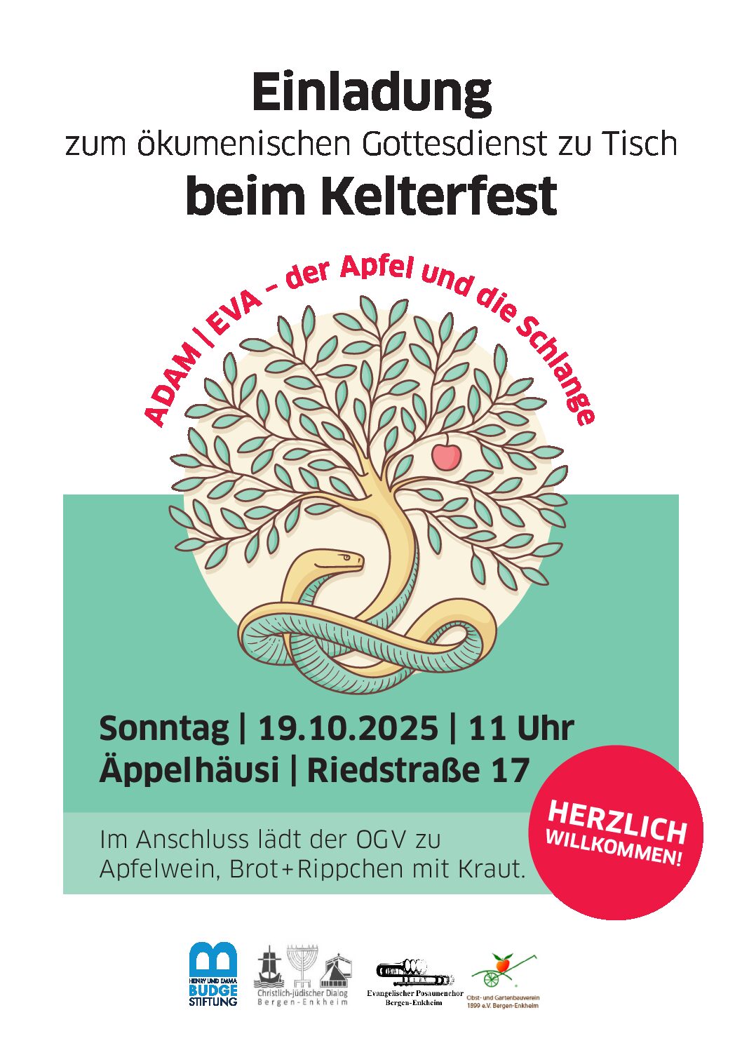 19. Oktober um 11 Uhr im Äppelhäusi, Riedstraße 19 mit: Rabbi Andrew Steiman (Henry und Emma Budg-Stiftung, Frankfurt), Veronika Brier (kath. Kirchengemeinde), Pfrin. Kathrin Fuchs Musikalische Begleitung: evangelischer Posaunenchor unter der Leitung