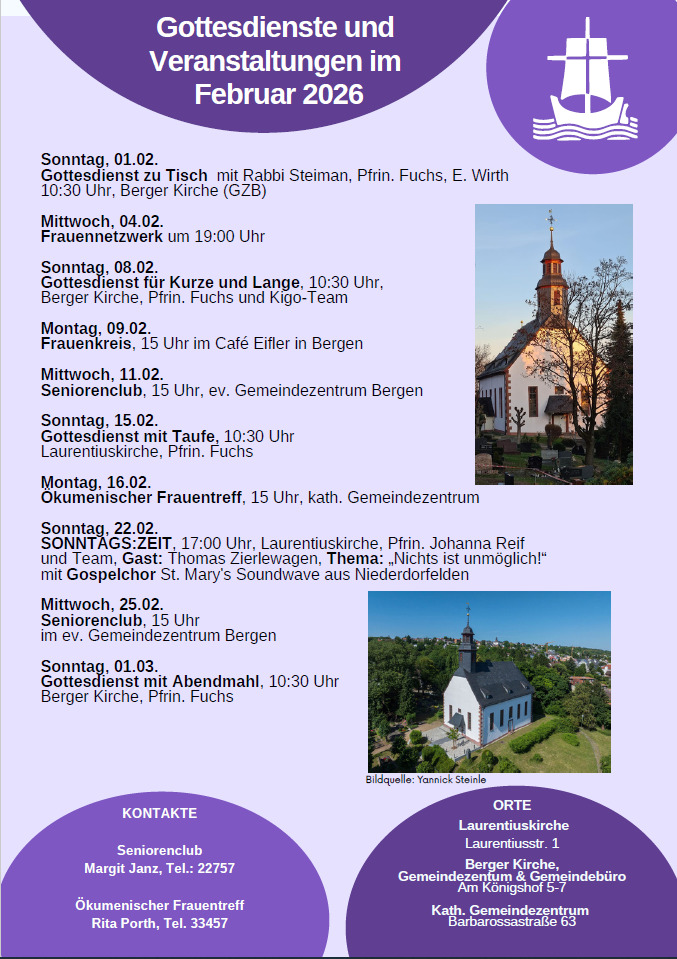 18.01. Laurentiuskirche, Enkheim 15.02. Laurentiuskirche, Enkheim 22.03. Ev. Kirche, Bergen 06.04. Ev. Kirche, Bergen, Osternacht...