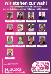 An diesem Tag sollen 10 Personen für den Kirchenvorstand in der evangelischen Brückengemeinde Heldenbergen gewählt werden. Insgesamt gibt es dieses Jahr 8 Kandidatinnen und 5 Kandidaten, die sich zur Wahl stellen. Jeder Wahlberechtigte hat 10 Stimmen. Wahlberechtigt sind alle evangelischen Gemeindeglieder, die 14 Jahre alt sind und das Wahlrecht nach den Bestimmungen der Grundordnung unserer Landeskirche haben.