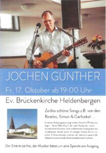 Am Freitag, den 17. Oktober 2025, ab 19.00 Uhr gastiert Gitarrist und Sänger Jochen Günther wieder in der evangelischen Brückenkirche Heldenbergen.