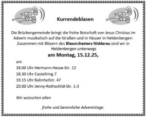 Zusammen mit Bläsern des Blasorchesters Nidderau sind wir in Heldenbergen unterwegs am Montag, 15.12.2025, um
