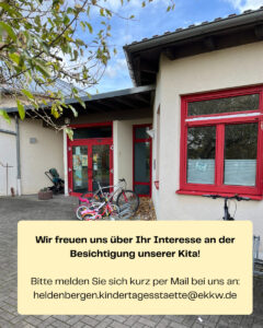 Bitte melden Sie sich kurz per Mail an, wenn Sie an einer Besichtigung teilnehmen möchten. Sie erreichen uns unter heldenbergen.kindertagsstaette@ekkw.de